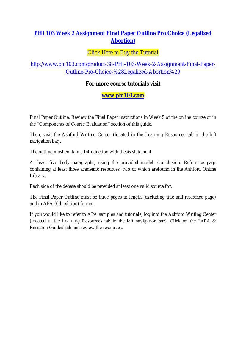 Outline of Final paper outline Paper The paper must be one to two pages not including the title and reference pages and formatted according to APA style as outlined in the Ashford Writing Center. Address all of the following parts of this assignment: 1. Prepare a one- to two-page double-spaced outline of your Final Paper.